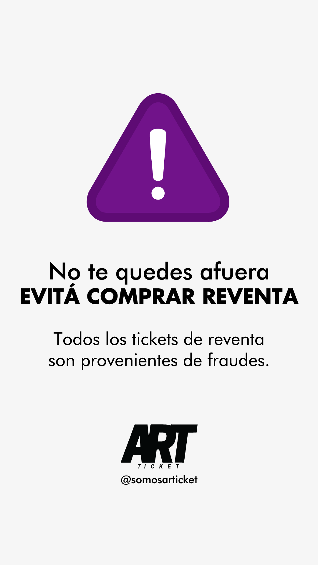 No compres tickets o entradas para espectáculos fuera de los canales habilitados por ARTICKET. Podrían venderte entradas falsas, adulteradas o robadas y no podrías entrar a ver el espectáculo o el evento deportivo.